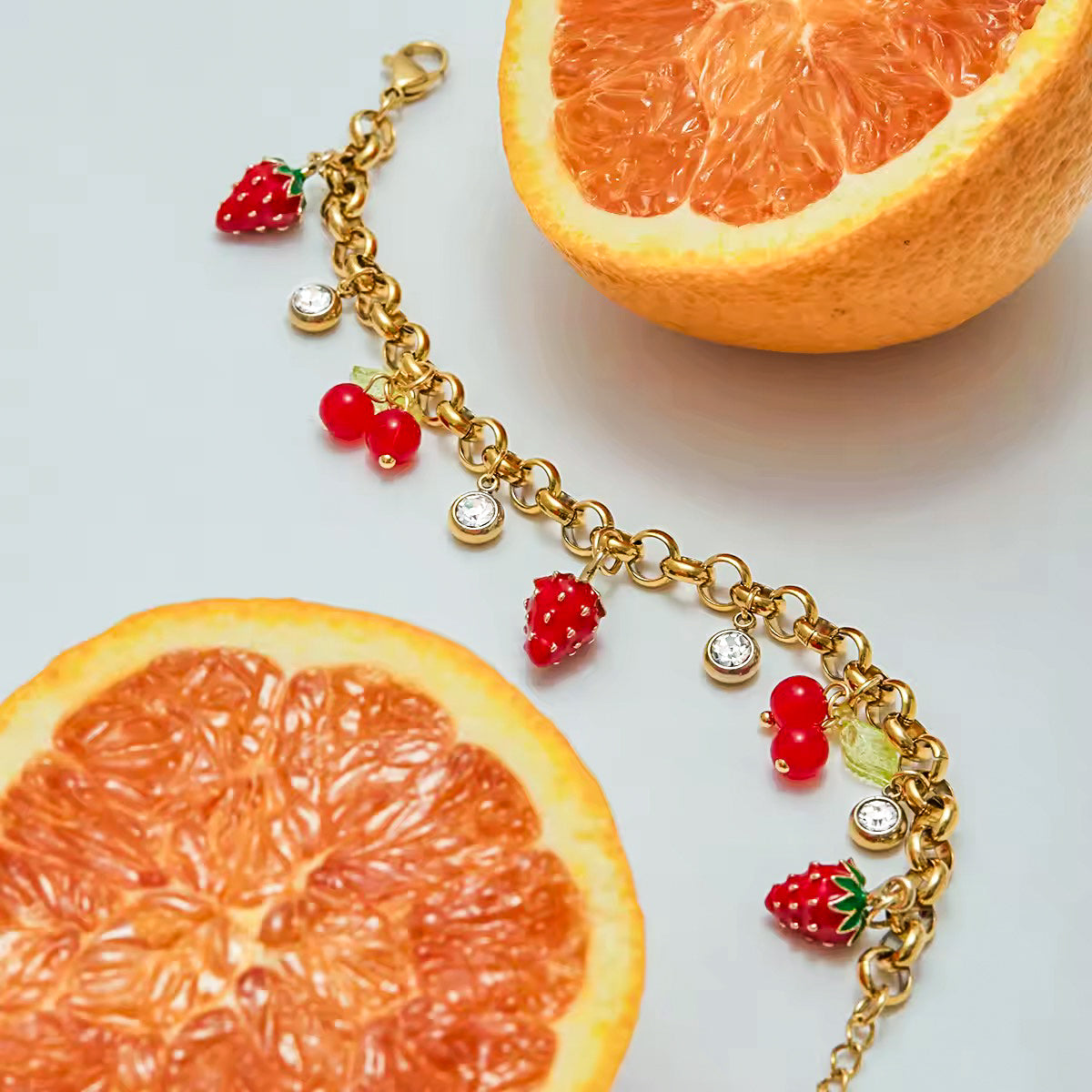 Onze elegante 100% waterdichte bessen- en kersenarmband zal perfect om je pols liggen om de mooiste looks te creëren. Hij is verkrijgbaar in 2 afwerkingen, goud en zilver, en is voorzien van prachtige parels en fruitbedels.