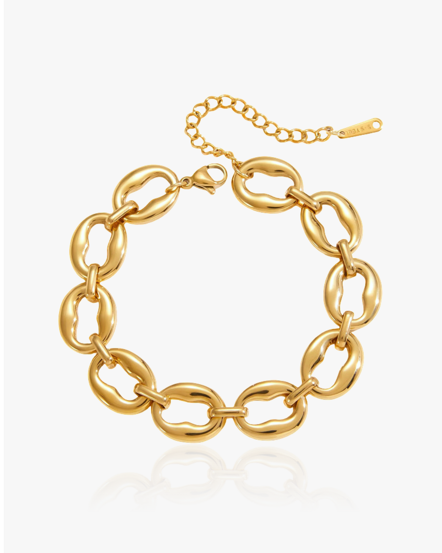 Onze elegante, 100% waterdichte maximalistische chunky armband in gesmolten esthetiek heeft een edgy 'it-girl' ontwerp. Deze statement armband valt perfect om je pols om de meest chique looks te creëren. Hij is voorzien van prachtige, onregelmatig gevormde schakels.
