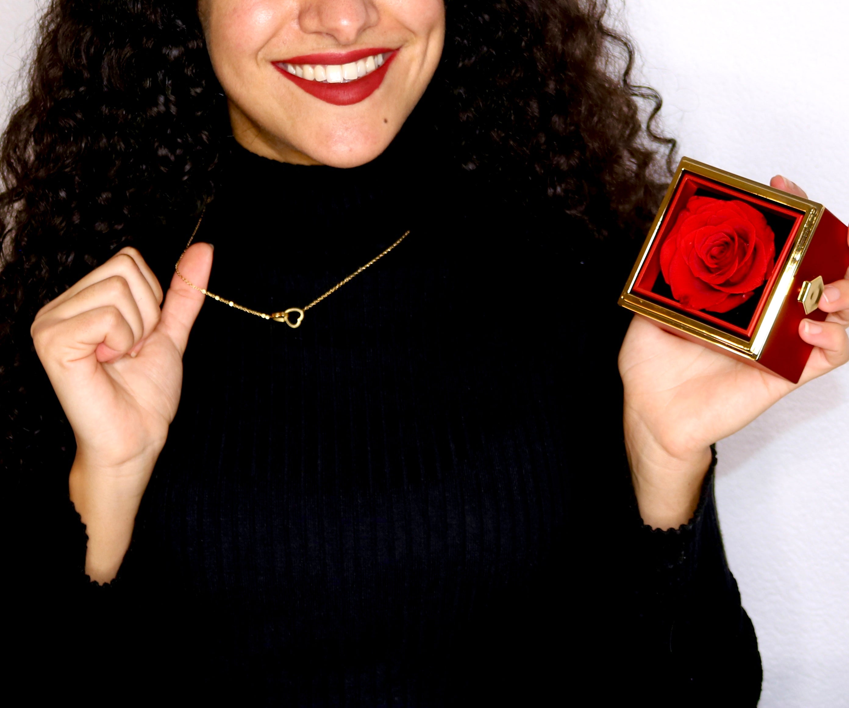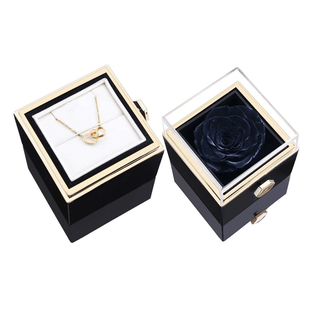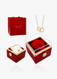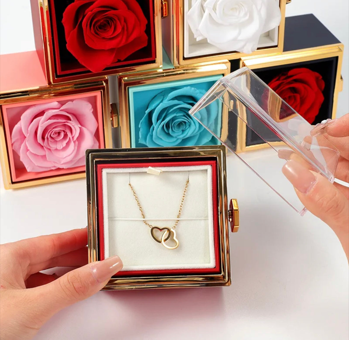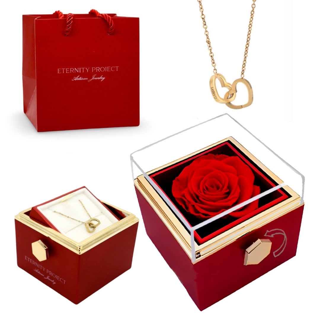 De tijdloze rozenbox, die een op maat gemaakte ketting bevat, is een cadeau dat voor altijd bedoeld is. Een echte roos wordt behandeld met een gepatenteerde technologie zodat de authentieke schoonheid nooit vervaagt, wat eeuwige liefde en genegenheid symboliseert.