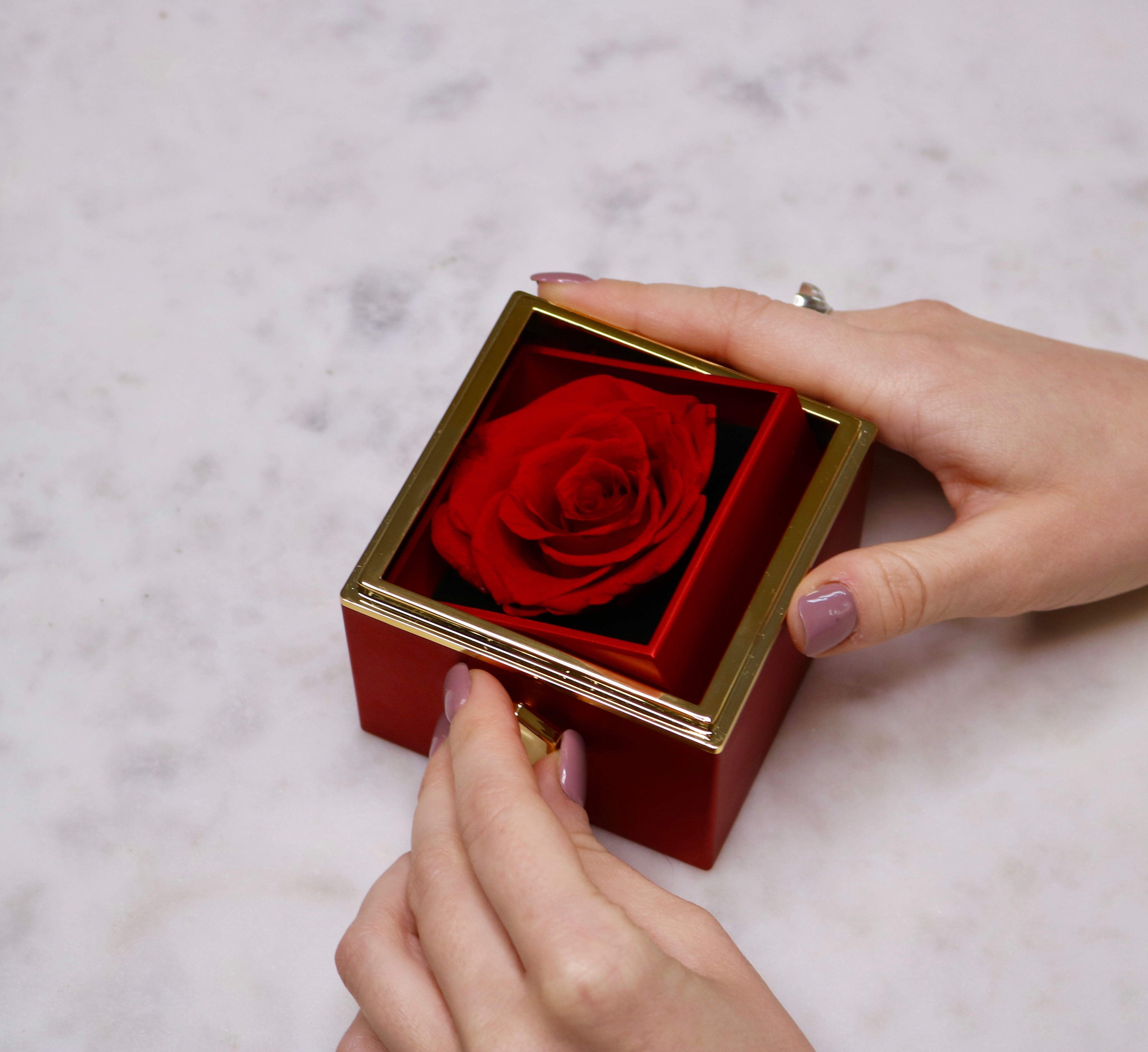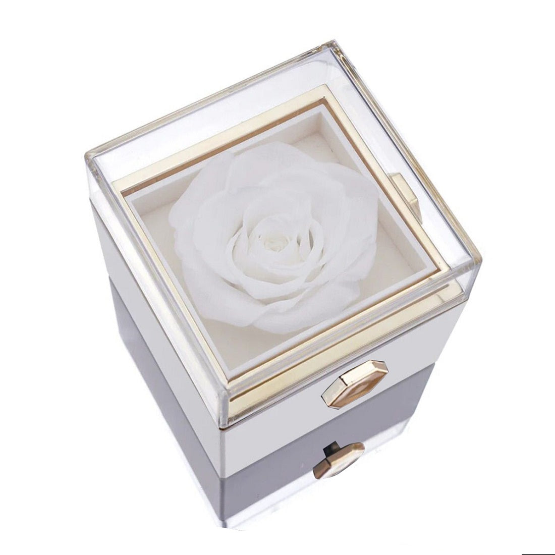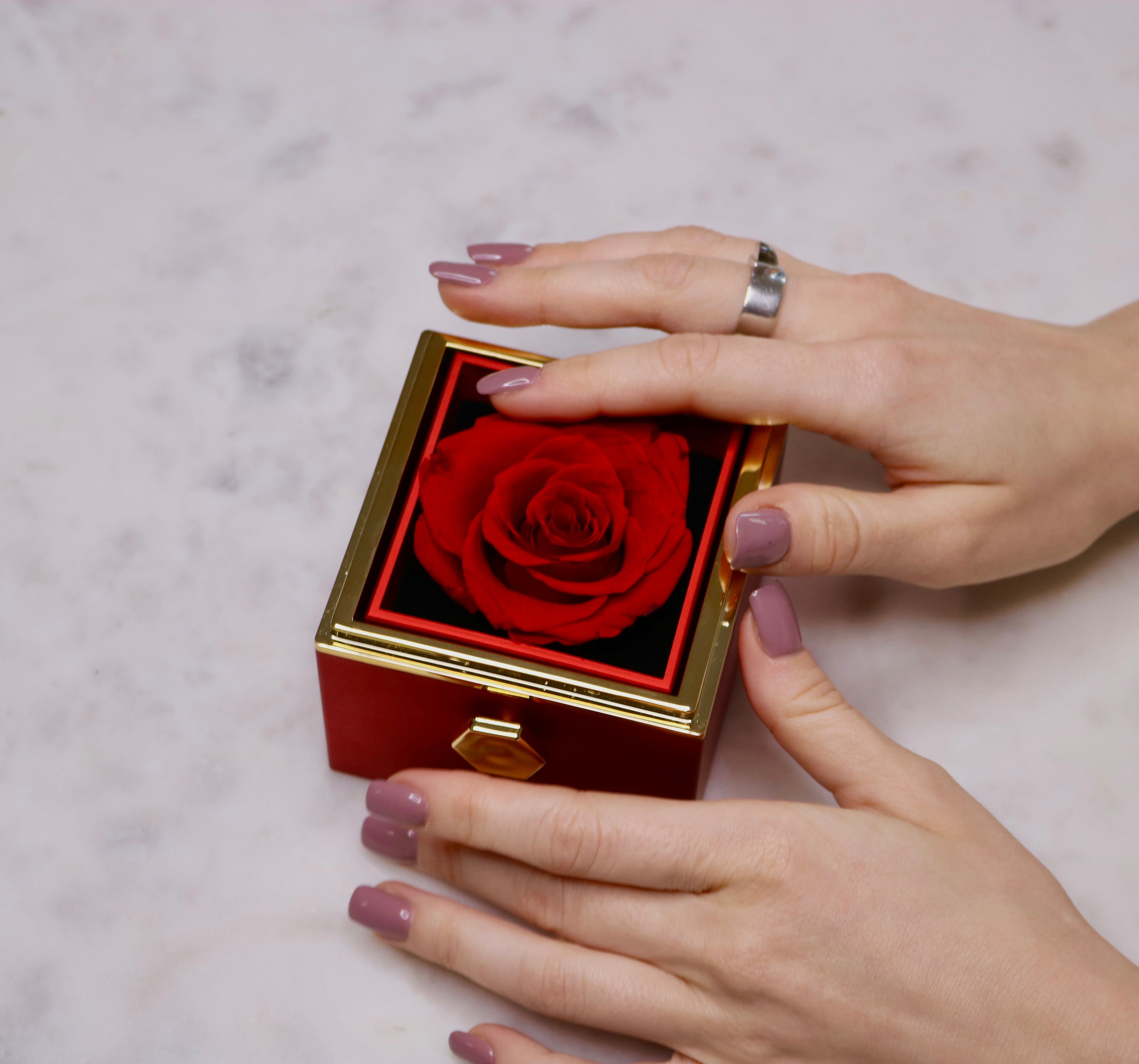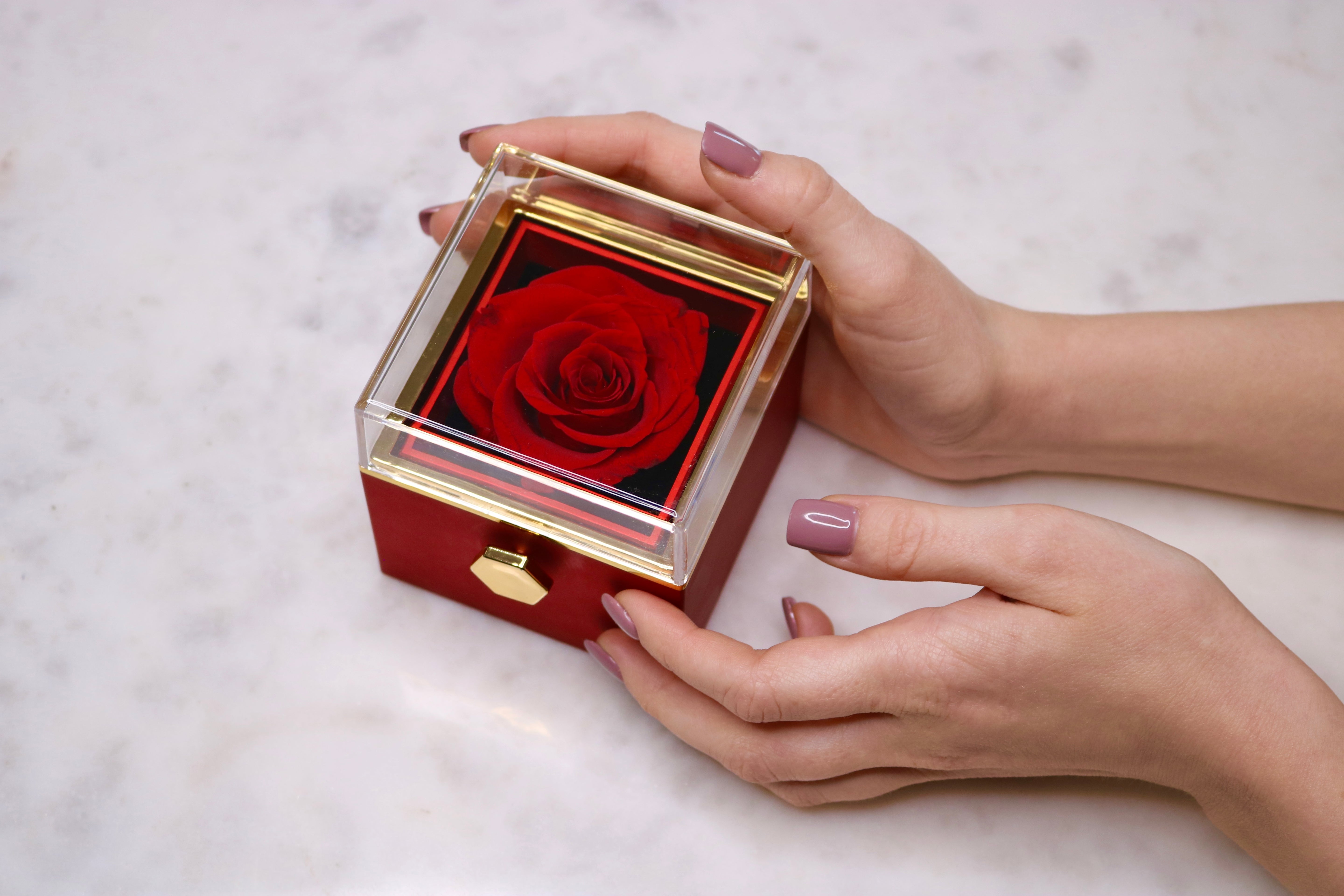 De tijdloze rozenbox, die een op maat gemaakte ketting bevat, is een cadeau dat voor altijd bedoeld is. Een echte roos wordt behandeld met een gepatenteerde technologie zodat de authentieke schoonheid nooit vervaagt, wat eeuwige liefde en genegenheid symboliseert.