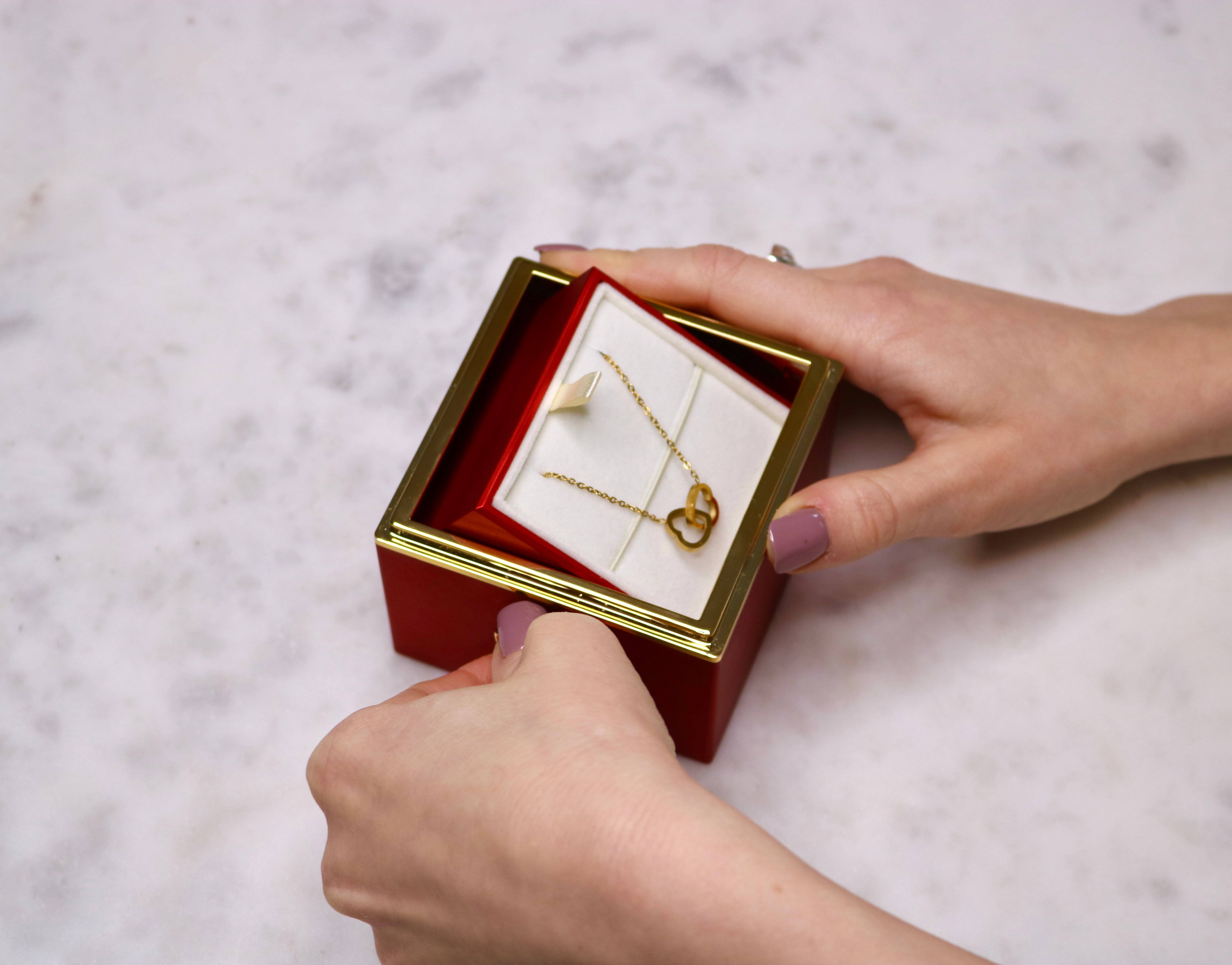 Het draaien aan een handvat aan de zijkant van de doos onthult een verborgen op maat gemaakte ketting van twee vergrendelde harten met de woorden van jouw keuze erop gegraveerd. Het is gemaakt van hoogwaardig roestvrij staal en verguld met een laag echt 18k goud, roségoud of 925 sterling zilver. Deze combinatie van materialen maakt het stevig en vrijwel onverwoestbaar.