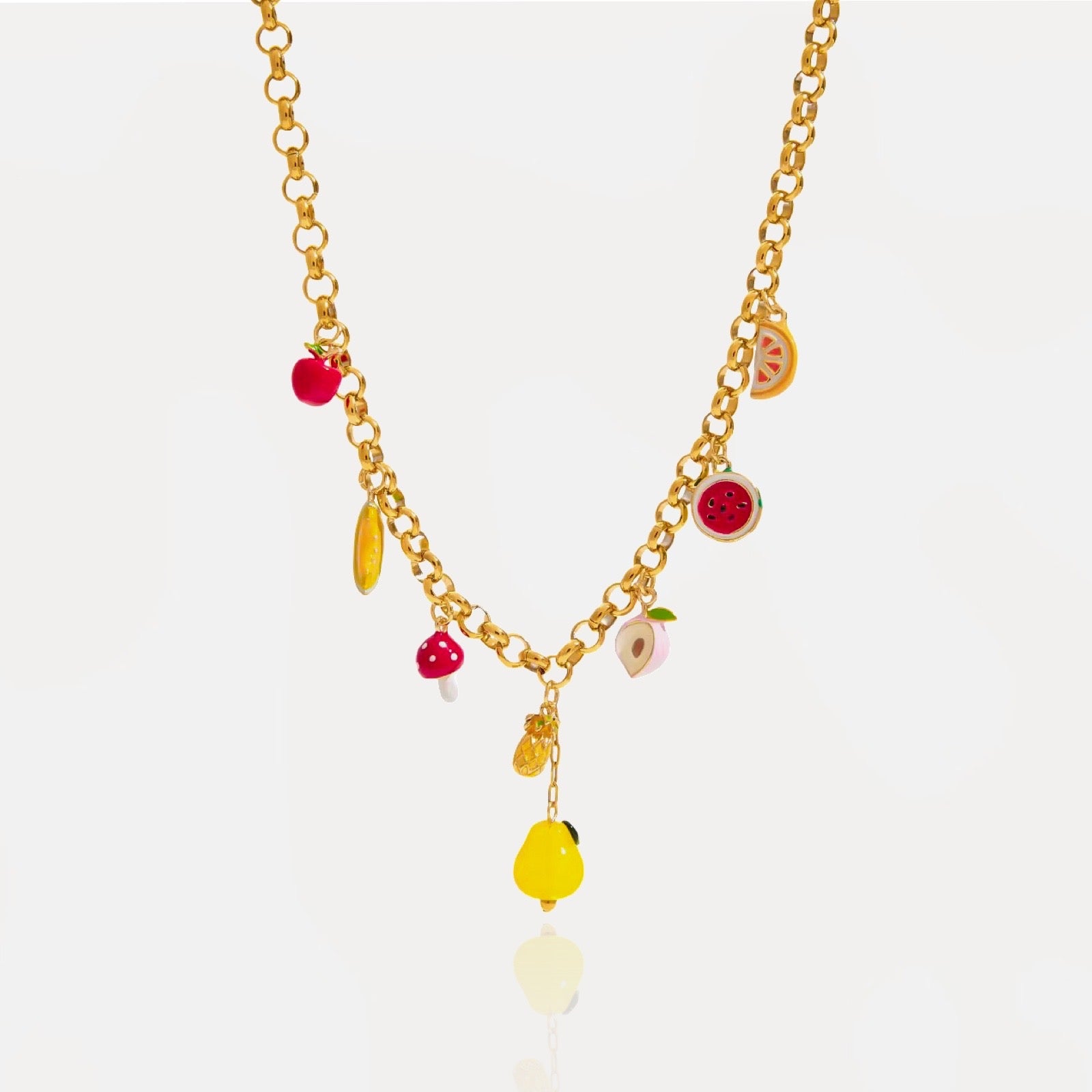 De mooiste ketting van dit zomerseizoen is hier! Onze handgemaakte Fruit Charms bolo ketting viert positiviteit en plezier. Hij is versierd met delicate bedeltjes van een paddenstoel, peer, perzik en banaan. Deze esthetische, strandvriendelijke statement ketting is een perfect alledaags sieraad omdat hij volledig waterdicht is en gemaakt is van premium roestvrij staal.