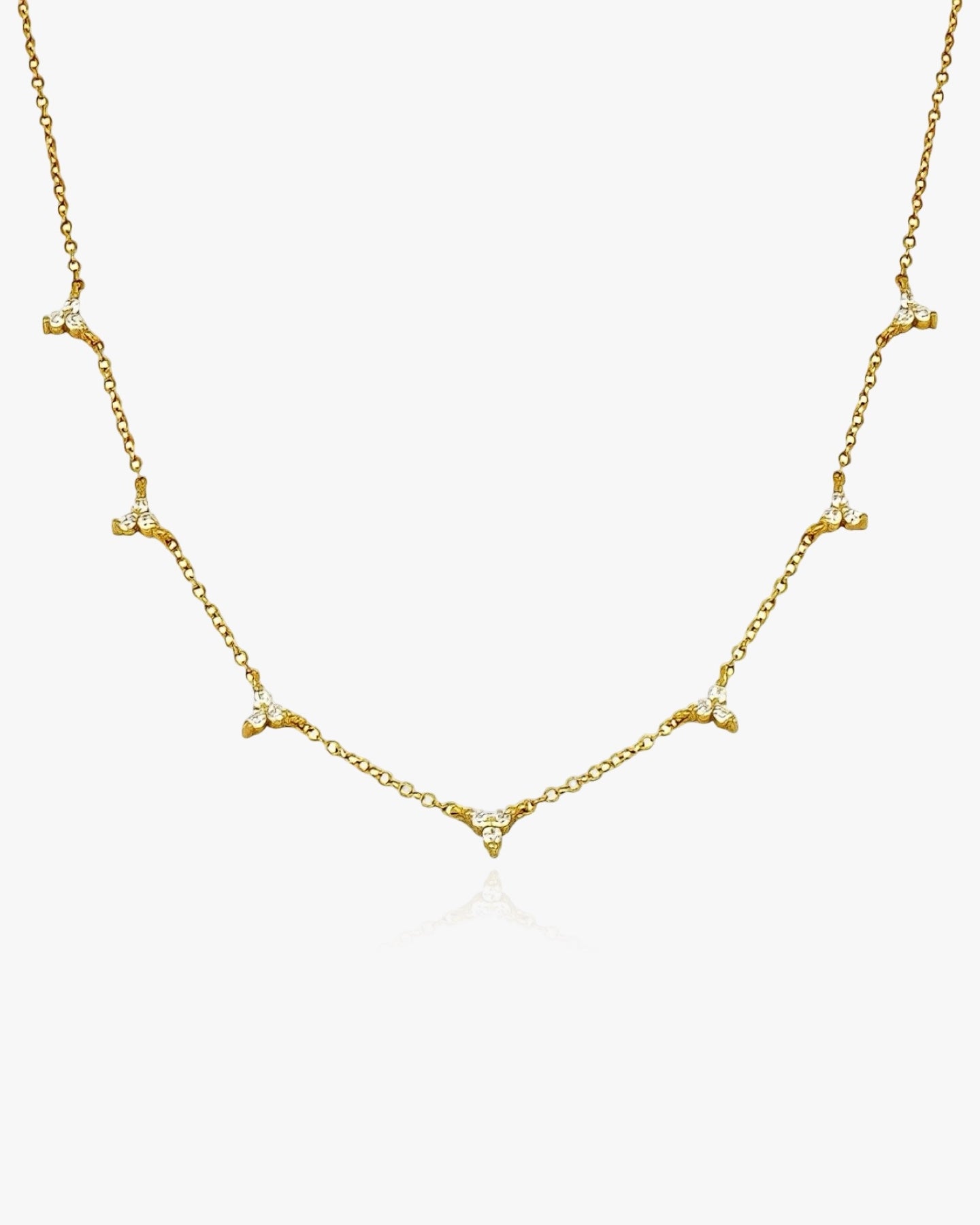 Onze delicate, fijne ketting met clusters van drie kristallen gerangschikt in driehoeksvormen herinnert ons aan geluk en overvloed. Hij is anti-aanslag, waterproof en versierd met glinsterende CZ-kristallen. Het materiaal van de ketting is hoogwaardig 925 sterling zilver, verguld met echt goud.