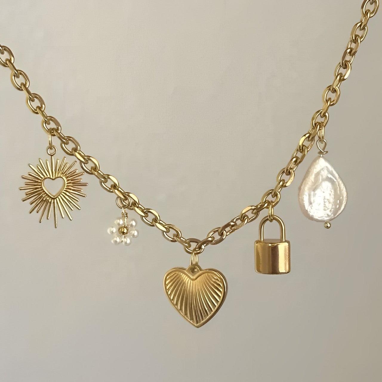 De mooiste halsketting van het seizoen is hier! Onze handgemaakte Loving Life ketting viert positiviteit. Het heeft een delicate bloem van parels, 2 harten en een natuurlijke parel. Deze esthetische halsketting is een perfect item voor elke dag omdat het volledig waterdicht is en gemaakt is van premium roestvrij staal.