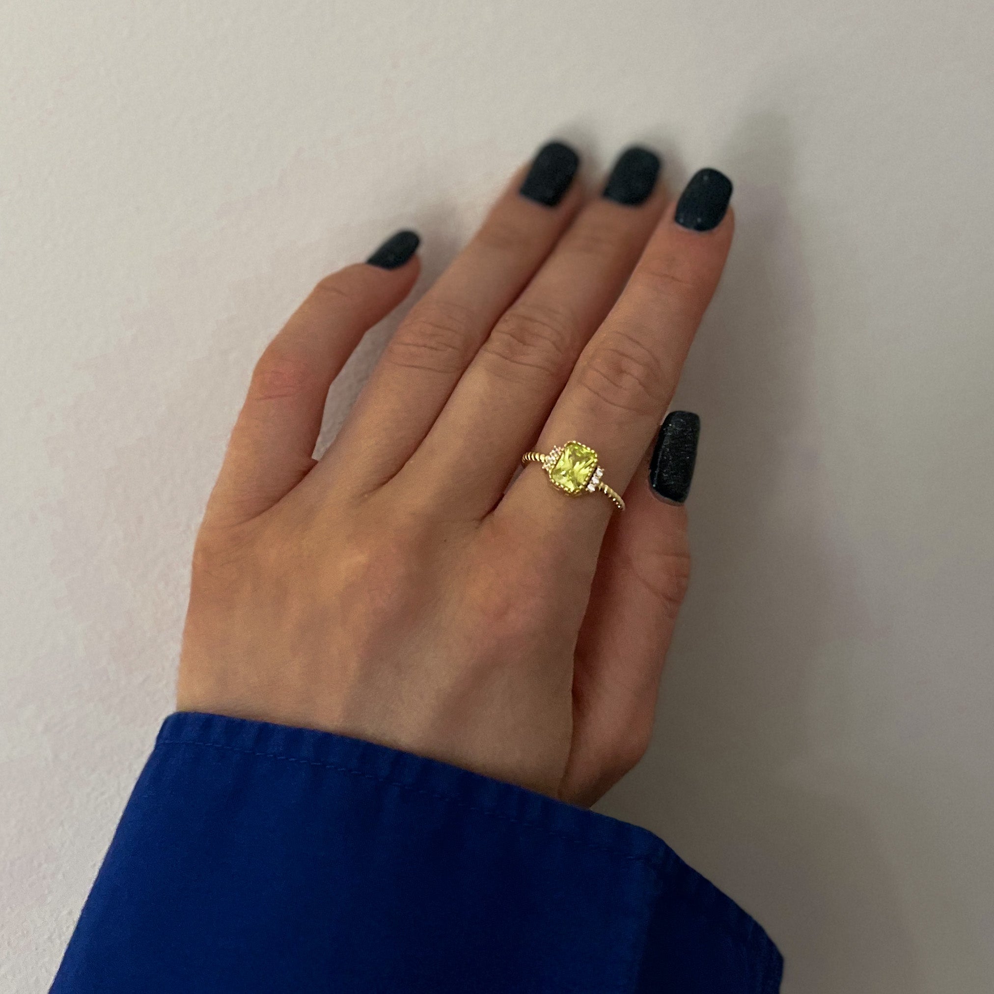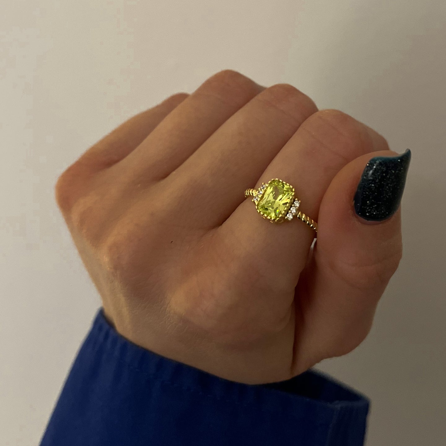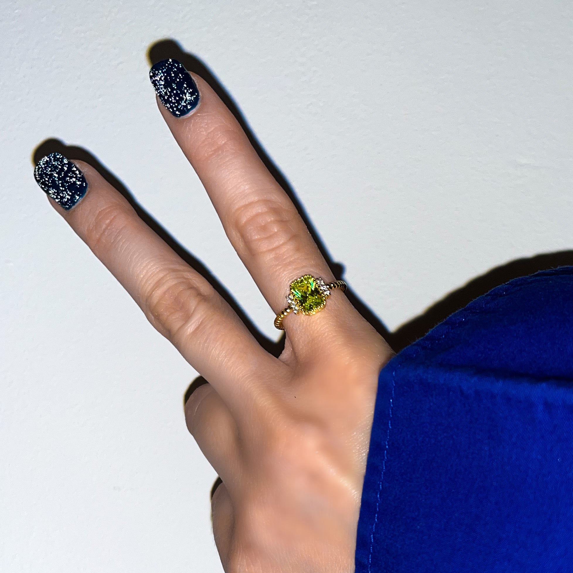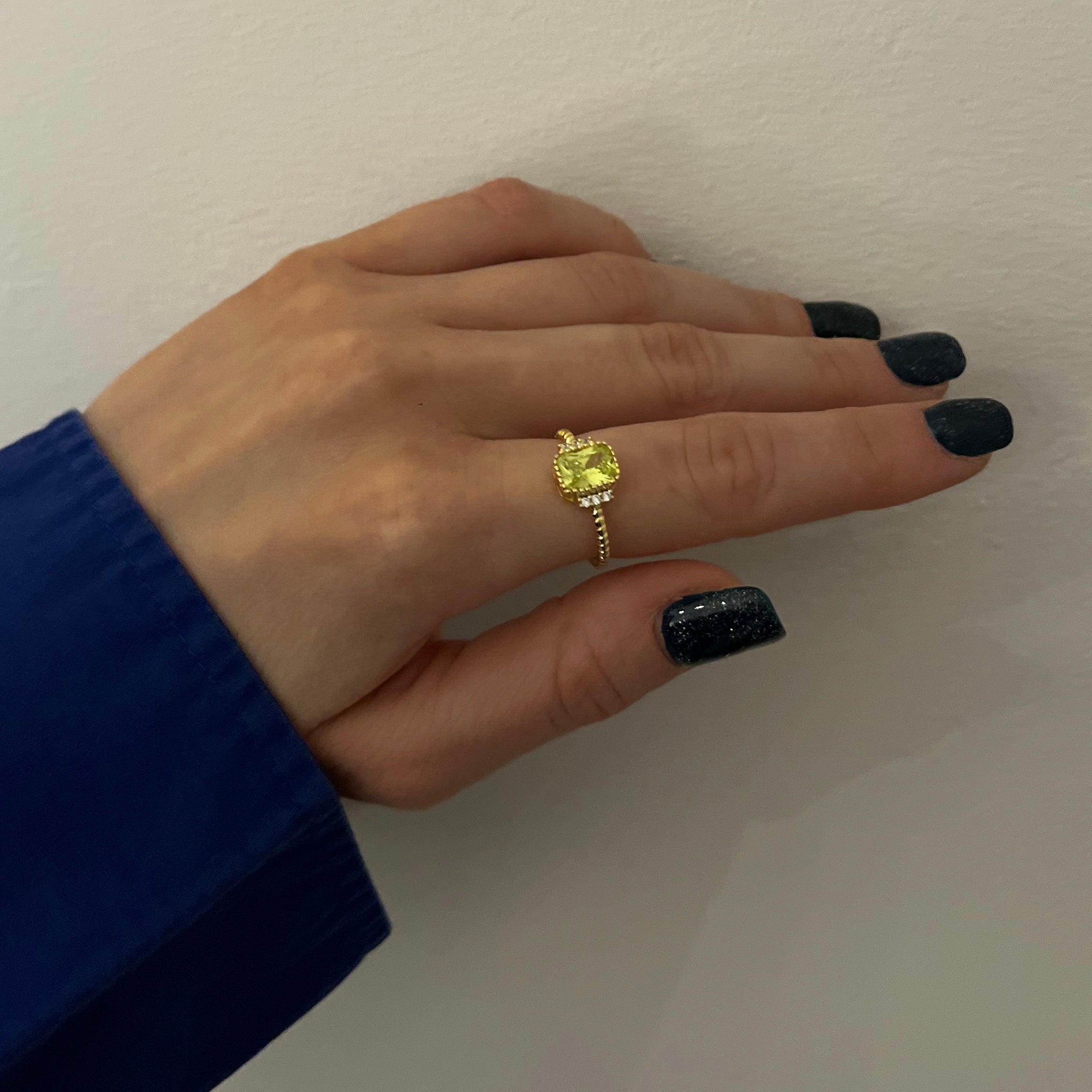 Maak kennis met onze meest magische ring tot nu toe: de dauwachtige limoen-groene Magic ring. Hij is versierd met prachtige kristallen en heeft een pure 925 Sterling Zilveren basis, waardoor hij volledig waterdicht is en voor altijd mooi blijft. De ring past op alle maten omdat hij een verstelbare basis heeft. Deze ring is een verantwoorde keuze: zijn esthetiek is tijdloos, zodat je hem kunt doorgeven aan de volgende generaties. Hij ziet er chique uit en is een perfect cadeau voor iemand speciaal.
