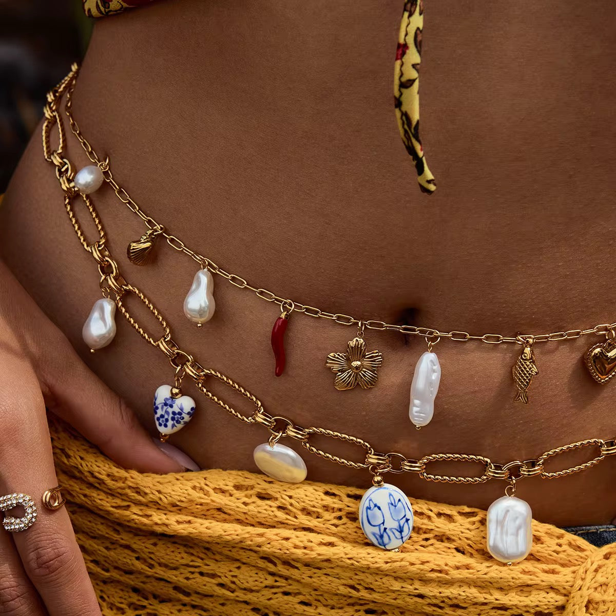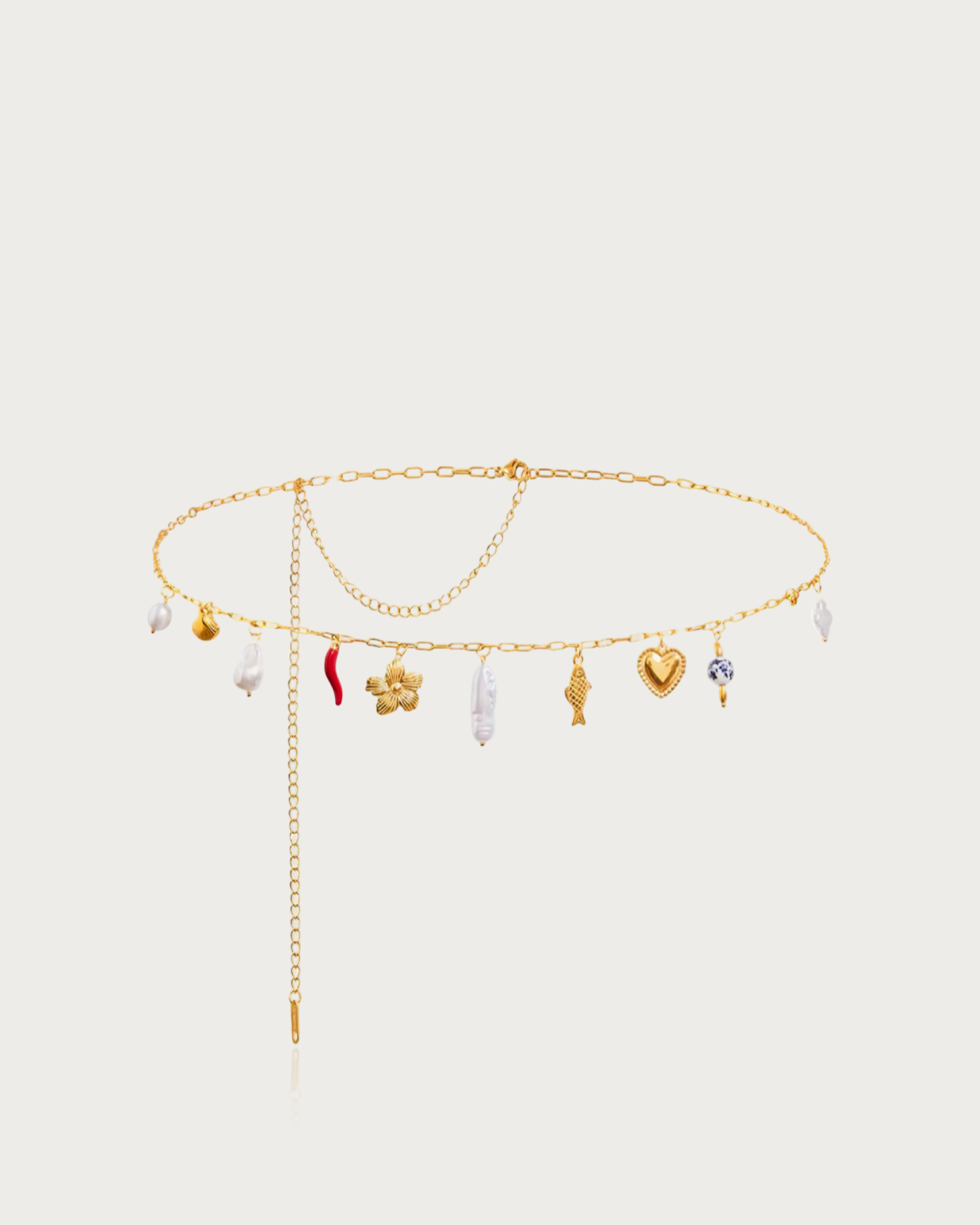 Onze stijlvolle waterdichte buikketting met bedels heeft een glinsterend 18K gouden oppervlak en is verstelbaar in maat. Hij past geweldig bij elke crop top of zwemkleding en tilt je look direct naar een hoger niveau. Deze heupketting met echte parels en handgeschilderde keramische porseleinen bedels is gemaakt om je er op elke gelegenheid schitterend uit te laten zien: een festival of het strand.