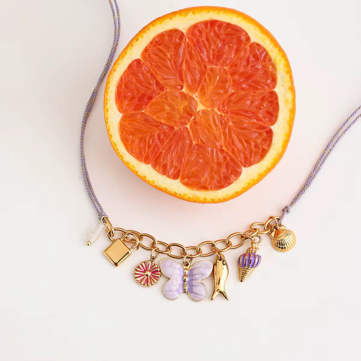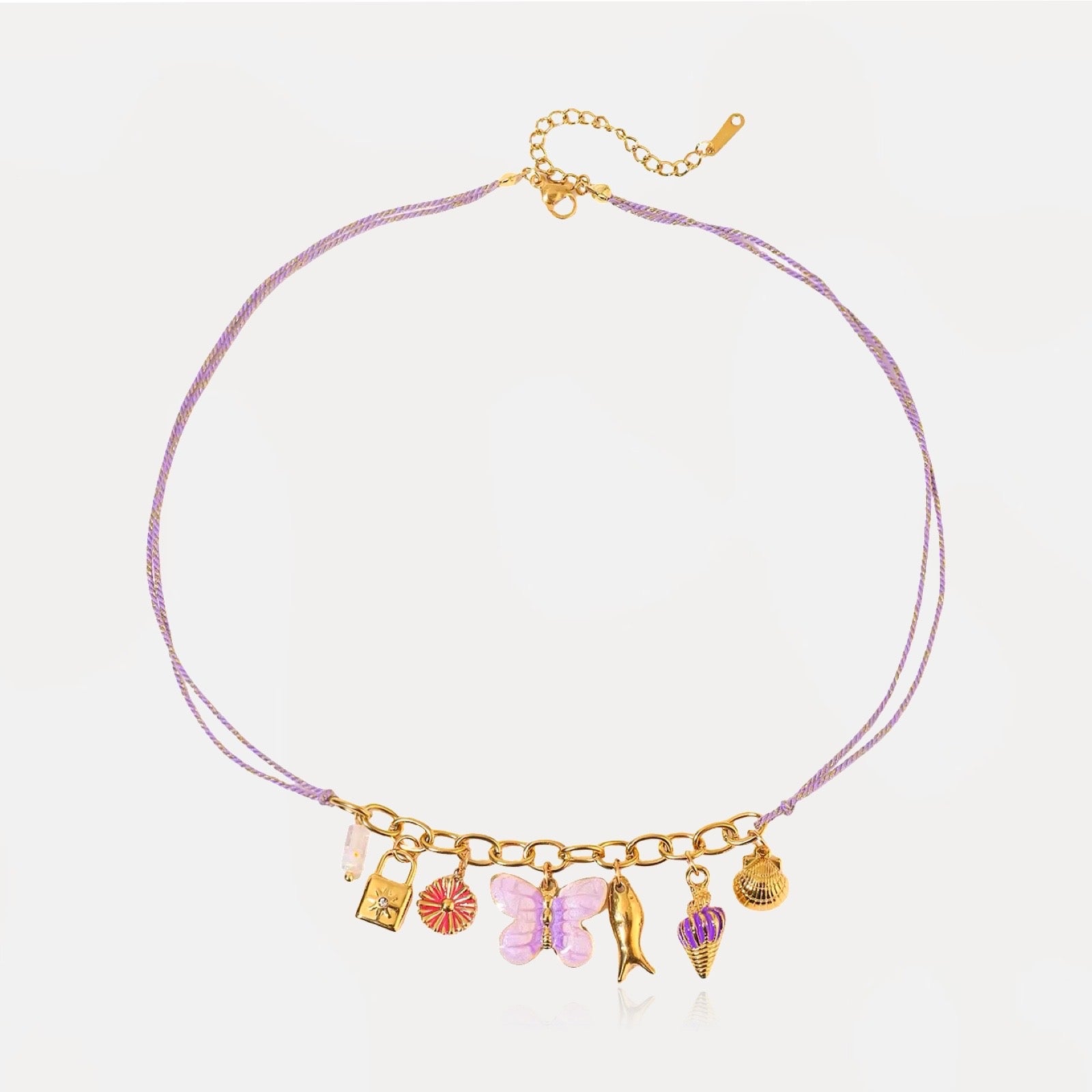 De mooiste ketting van dit zomerseizoen is hier! Onze handgemaakte Summer Charms koordketting viert positiviteit. Hij is voorzien van een delicate paarse vlinderbedel, schelpen, ondeugende visjes en bloemen. Deze esthetische statement ketting is een perfect alledaags sieraad omdat hij volledig waterdicht is en gemaakt is van premium roestvrij staal.